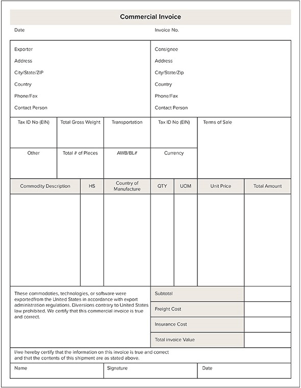 A commercial invoice must be supplied for each consignment. It must outline the goods being exported and their value, issued by the seller stating what was sold and the sale price. It is important to review where these come from in your business. Link to an example >
